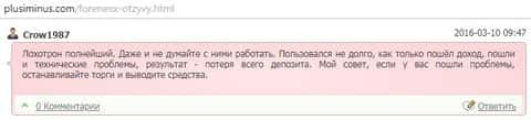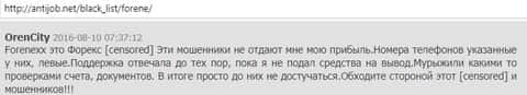 Еще один из любителей Forex, а именно некий Краув 1987, поведал нам о том, что брокерская компания Форенекс является очередным онлайн-лохотроном в глобальной сети, потому как любые вложения денег в сею сомнительную контору не принесут Вам никаких прибылей, потому как весь ихний трейдинг рассчитан на полный слив клиентского депо, а если даже и получите профит, то вывести все равно ее не удастся, ведь дело то имеем с явными аферистами.