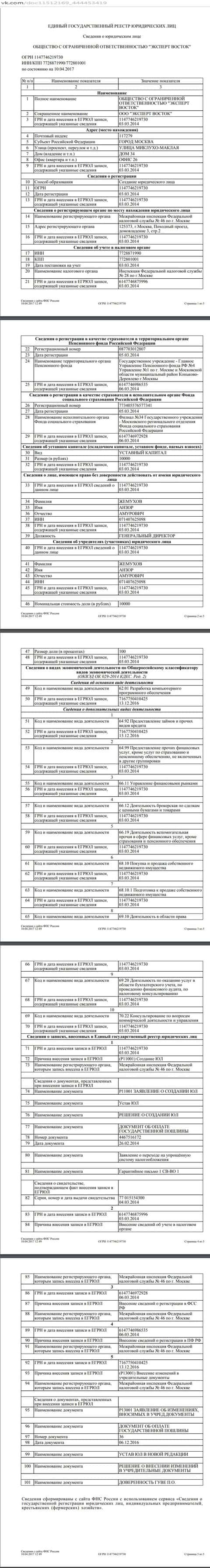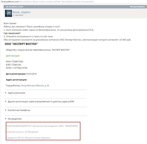 Ссылаясь на информацию из предыдущего подраздела, а именно - на сведения о тесной связи конторы Форенекс с юридическим лицом РФ под названием Эксперт Восток, предлагаю вашему вниманию публикацию с документом о регистрации сей организации, где можно детально ознакомится с важными данными, включая размер уставного капитала и инициалы лиц, которые занимают руководящие должности в ДЦ Forenexx.