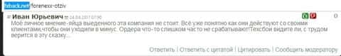 Человек по имени Иван делится своими впечатлениями от процесса трейдинга в дилинговом центре Форенекс. Автор заявляет о наличии проблем с исполнением ордеров, а именно - о невозможности закрыть торговую сделку, из-за чего клиент теряет свои деньги.