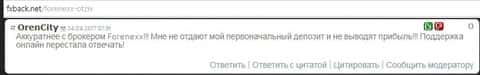 Пользователь глобальной сети с никнеймом Орен Сити заявляет о том, что после того, как ему в дилинговом центре Forenexx отказали в выводе денежных средств с торгового счета, служба клиентской поддержки у данного брокера также начала действовать в интересах в сей мошеннической бизнес-деятельности, потому как все попытки трейдера связаться с ней не увенчались успехом.