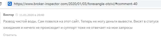 Обманутый трейдер на странице сайта информационного портала broker-inspector com называет деятельность брокерской конторы ForexAngle чистейшим разводиловом и рассказывает, что аферисты из этой компании после запроса на вывод денег не отвечают клиенту, служба поддержки также никак не реагирует.