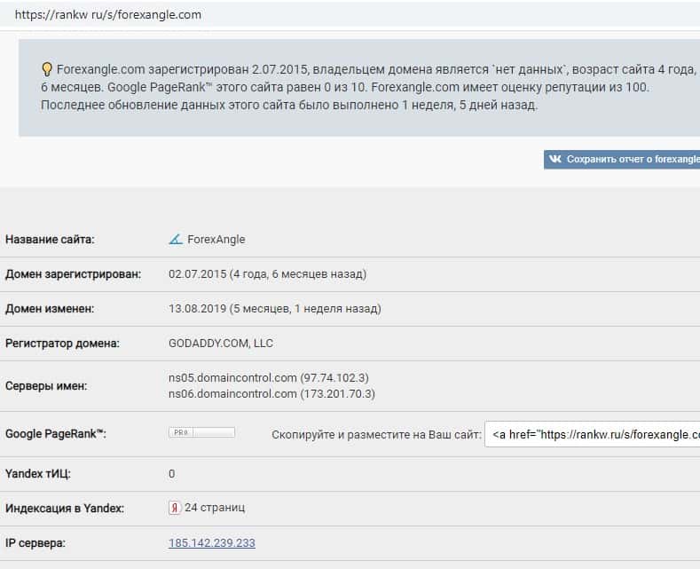 Интернет-ресурс rankw ru проанализировал доменные данные сайта ForexAngle Com