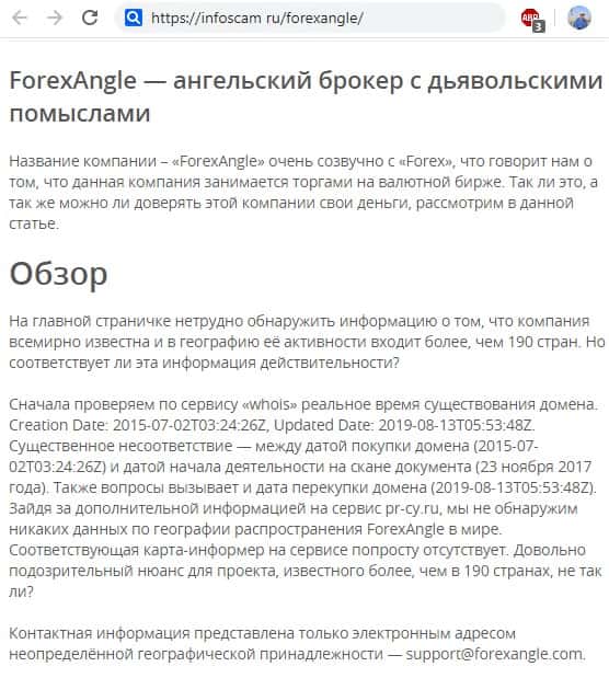 Веб-ресурс infoscam ru подготовил обзор сайта брокерской конторы ForexAngle Com. В ходе исследования установлено несоответствие дат покупки домена и регистрации компании, ложность заявлений о всемирной известности этого форекс-брокера, отсутствие сведений о географической принадлежности и исчерпывающих контактных данных этого форекс-проекта.