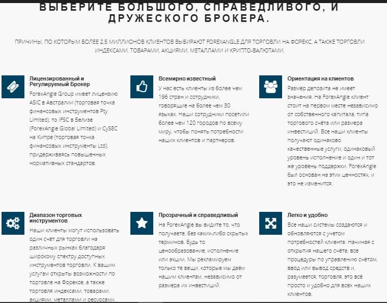 Исследовав официальный сайт брокерской компании ForexAngle Com, хочется сказать, что этот интернет-ресурс крайне малоинформативен. Начинается он с традиционной саморекламы, а вот полезную для трейдера информацию на этом интернет-портале отыскать достаточно сложно. А можно ли доверять этой саморекламе? – вопрос довольно спорный.