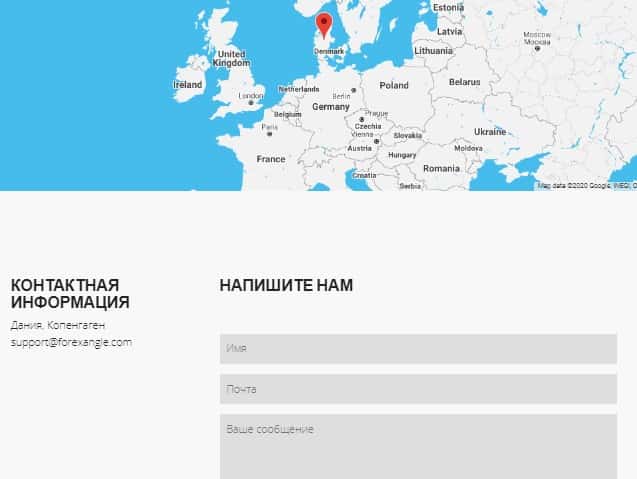 На официальном сайте брокерской компании ForexAngle Com при переходе по ссылке «Контакты» в попадаете в раздел «Контактная информация», где на самом деле никакой контактной информации нет, за исключением непонятного европейского адреса и электронной почты: Дания, Копенгаген, [email protected]. И все!
