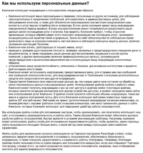 Мошенники из дилинговой компании ForexAngle оставляют за собой право предоставлять личные данные клиентов своим поставщикам услуг и агентам, другим компаниям и третьим лицам. При этом сотрудники этой конторы могут проводить проверки удостоверений личности клиентов и устанавливать их кредитоспособность через банковские учреждения.