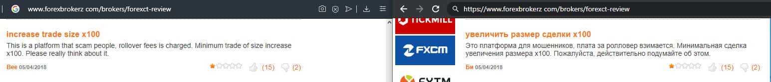 Человек довольно долго работал с брокерской конторой ForexCT и он решил рассказать, что он о них узнал. По его мнению при хеджированой позиции, когда намерен закрыть прибыльную сделку, по итогу получается отрицательный результат. Работать там не стоит, так как плюсовые сделки в наглую обрезают.