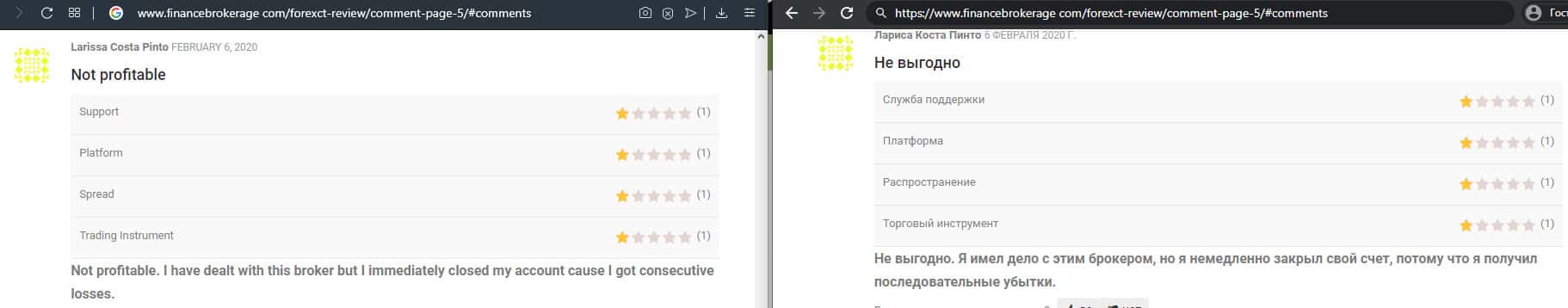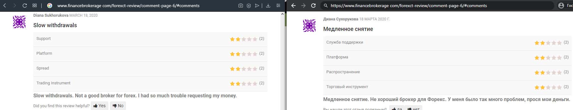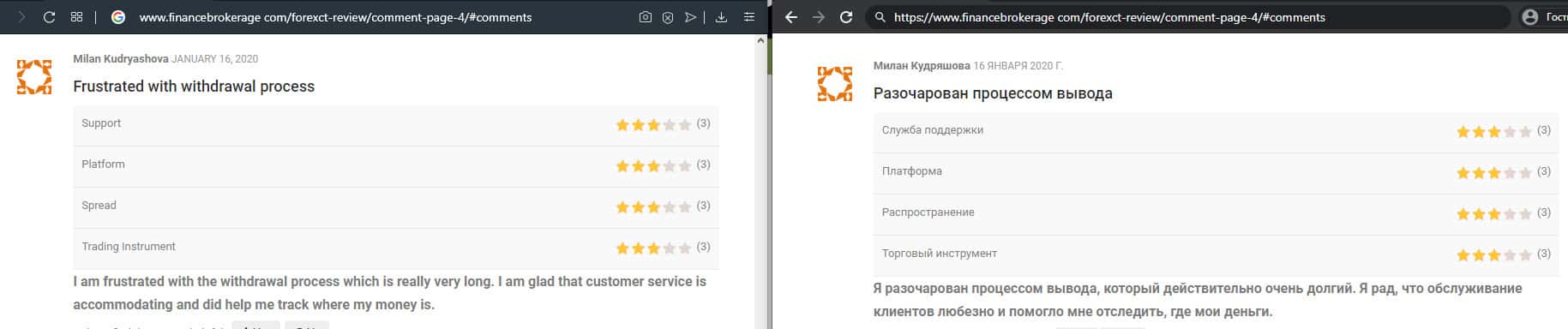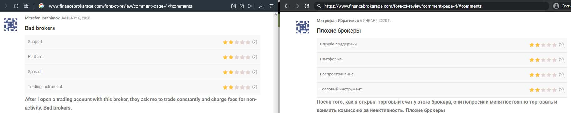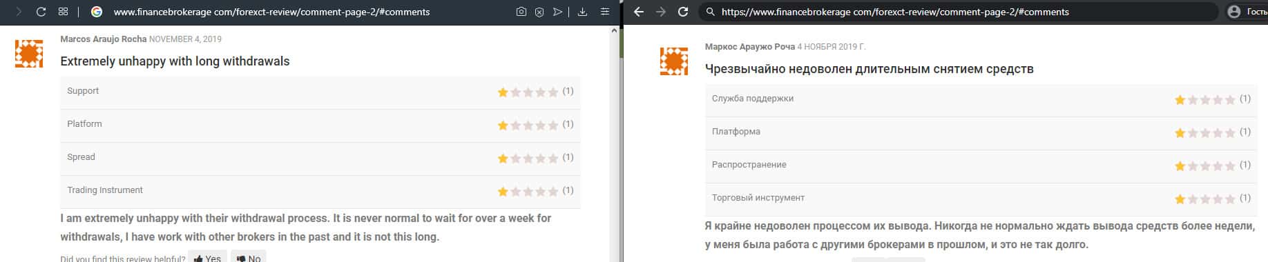 Очередной факт мошенничества со стороны брокерской конторы ForexCT, так как человек вложил туда деньги, а соответственно обратно вернуть не смог. Он поставил заявку на вывод, но не может никаким образом добиться разъяснения, почему они ее не обрабатывают. Очень жаль, что из всех брокеров попались именно эти жулики.