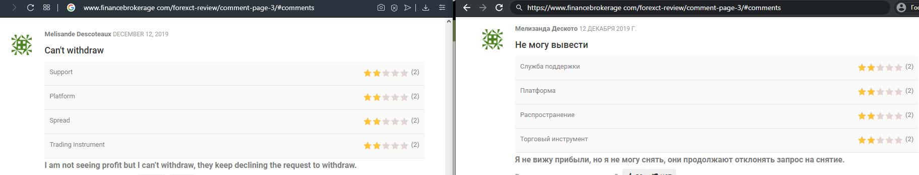 Еще один отзыв посвящен подтверждению, что мошенники ForexCT никаким образом не выводят средства своим клиентам. Аферисты уговаривают людей сделать перевод под разными предлогами, а после перевода менеджеры начинают менять тон. Если вы не согласитесь на повторное вложение, то вообще перестанут с вами общаться.