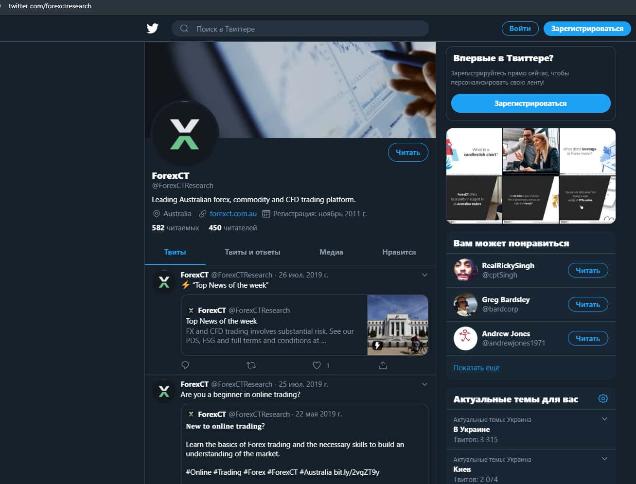 Брокерская контора Форекс СТ занимается постоянным поиском новых лохов для своего проекта, поэтому решила охватить как можно большую аудиторию с помощью социальных сетей. Первый на очереди Твиттер, где они за все время существования собрали всего-лишь 450 подписчиков. Вот ссылка на профиль twitter com/forexctresearch