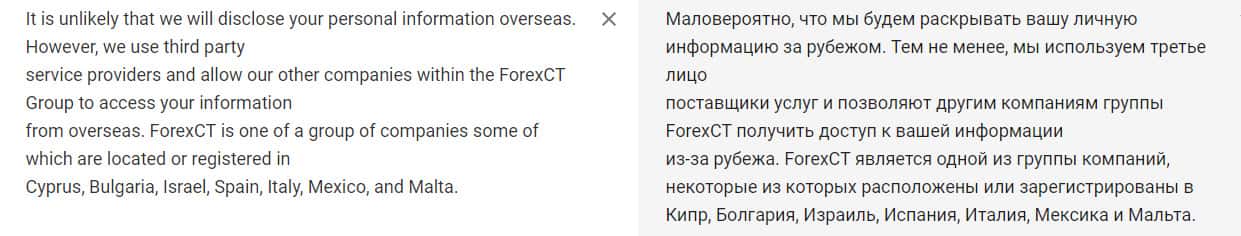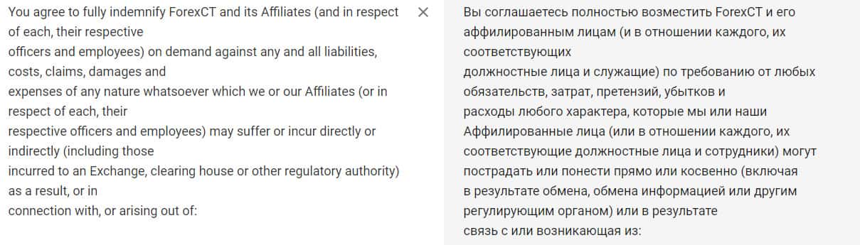 Тоже самое касается личных данных клиентов, где аферисты конторы ForexCT имеют право разглашать ее аффилированным лицам и не нести за это ответственность. Если вдруг она где-то всплывет в другом месте, либо просто будет использоваться не по назначению, то здесь тоже получается лохотрон Форекс СТ не при чем.