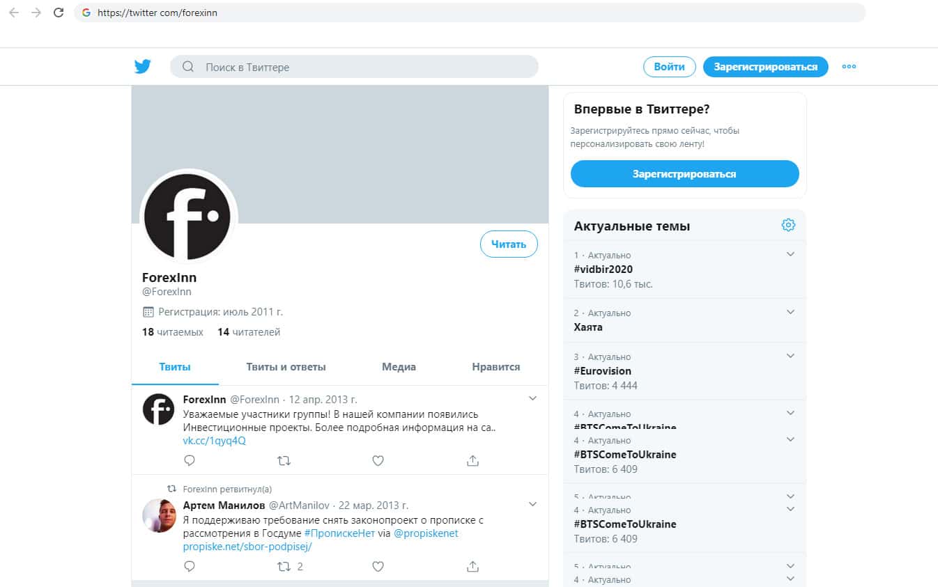 Всё, что осталось от фирмы мошенников Форекс ЛНН это всего две страницы в социальной сети. Одна из которых находится на твитере. На ней у компании осталось всего 14 подписчиков, и скорее всего это те, которые эту страницу и создали. Жулики не стали заморачиваться с её удалением так как она не пользовалась никакой популярностью среди пользователей.