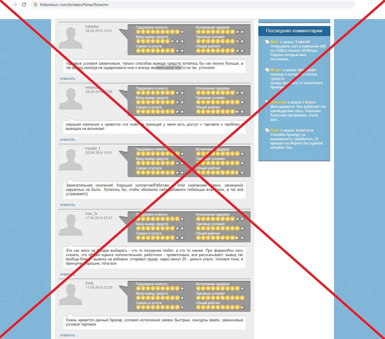 Во время своей работы компания махинаторов ForexInn старалась сохранить свою репутацию, и часто публиковали заказные отзывы. Жулики платили неким пользователям деньги за то, что бы они печатали положительные отзывы о фирма аферистов. Это позволяло мошенникам обманывать тех людей. которые верили в эту ложь.
