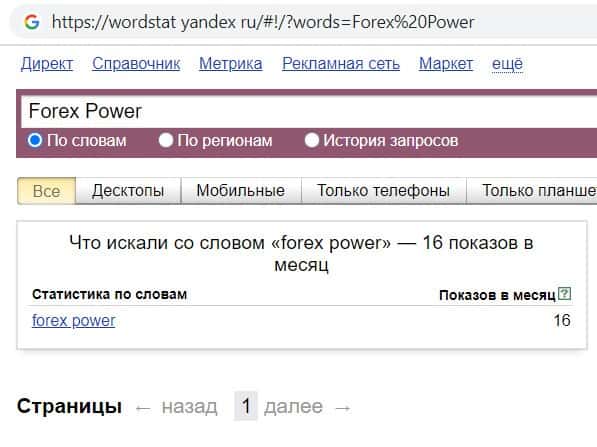 Так же мы проверили количество запросов фальшивого отзовика ForexPower Ru по названию компании, но с пробелом, а именно "Forex Power", но и этот запрос пользователи не выполняли.
