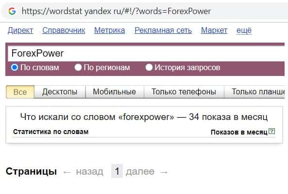 Мы проверили количество запросов компании мошенников ForexPower Ru в Яндексе по названию фирмы, а именно "ForexPower". Данный запрос пользователи пользователи выполи 34 раза.