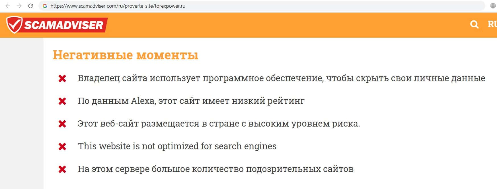 Мы проверили интернет-ресурс отзовика ForexPower Ru через сайт scamadviser com. Оказалось, что сайт содержит подозрительные ссылки, а его владелец скрывает свою личность.