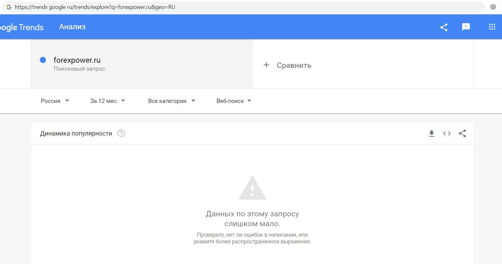 Мы решили проверить количество запросов фальшивого отзовика ForexPower Ru в Google по названию компании, а именно "ForexPower", но этот запрос пользователи не выполняли.