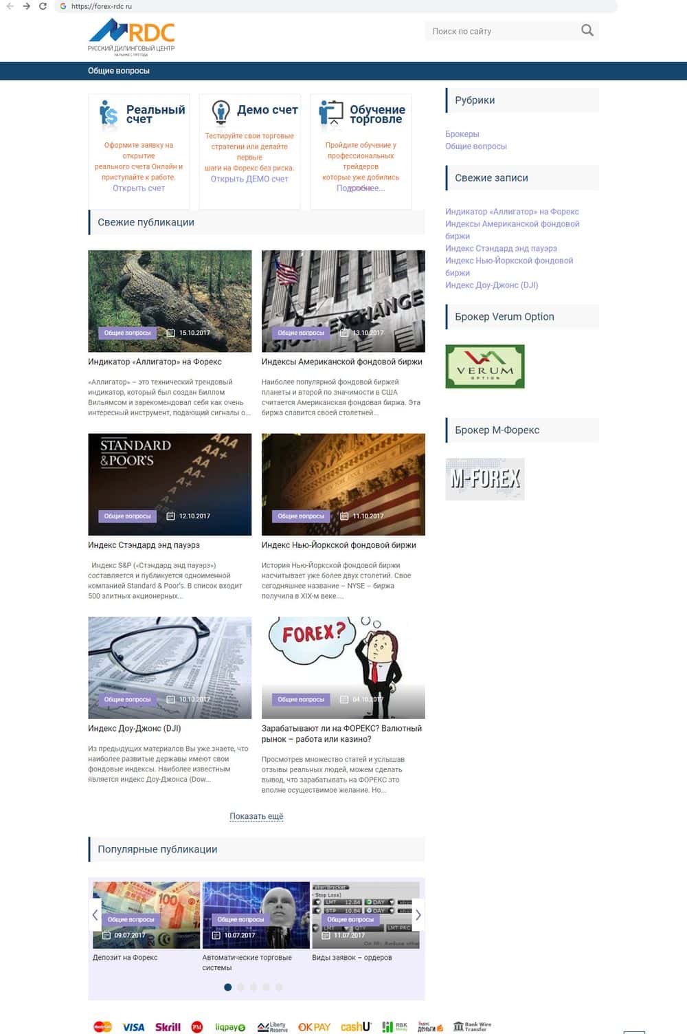 Основной ресурс кидал Русский Дилинговый Центр склепан настолько паршиво, что непонятно, как трейдеры могут на него вестись. Создан он в 2017 году, хотя аферисты утверждают, что работают на 10 лет больше. Страничка заполнена псевдо-обучающими статьями, никакой конкретной информации не содержит.