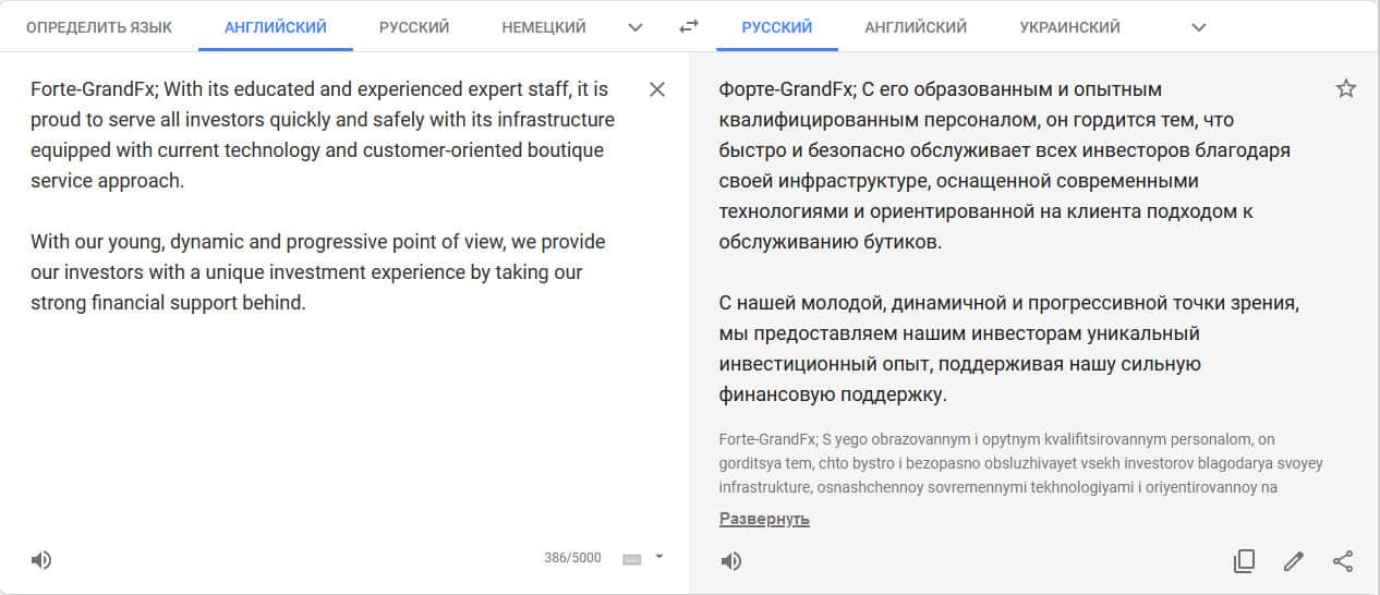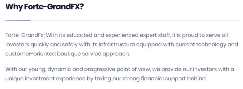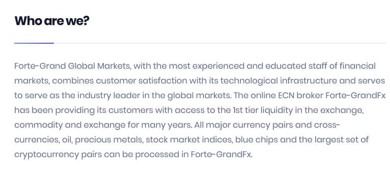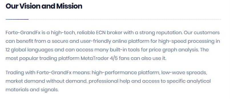 Здесь точнее было бы вставить, потому что Forte-GrandFX разведут вас на деньги, поэтому связываться с ними крайне нежелательно. Но они о себе пишут другое, что они быстро и безопасно обслуживают клиентов и т.д. Все это вранье разумеется, потому что ничего такого они не делают.