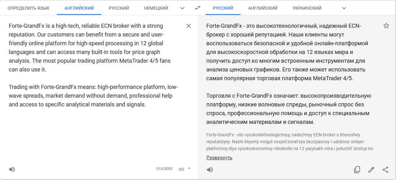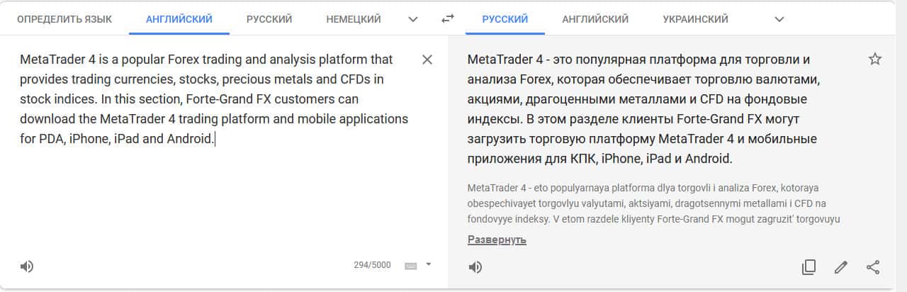 Перевод описания платформы MetaTrader 4 на сайте translate.google com.