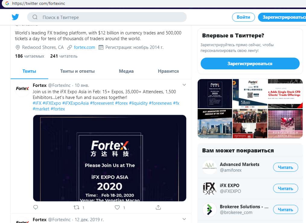 Имеется у аферистов Фортекс и страница в социальной сети Twitter, где у шулеров Fortex размещена довольно стандартная и типичная лапша на уши и имеется всего несколько сотен подписчиков. На изображении, расположенном ниже, вы можете наглядно увидеть страницу аферистов Fortex в социальной сети Твиттер.