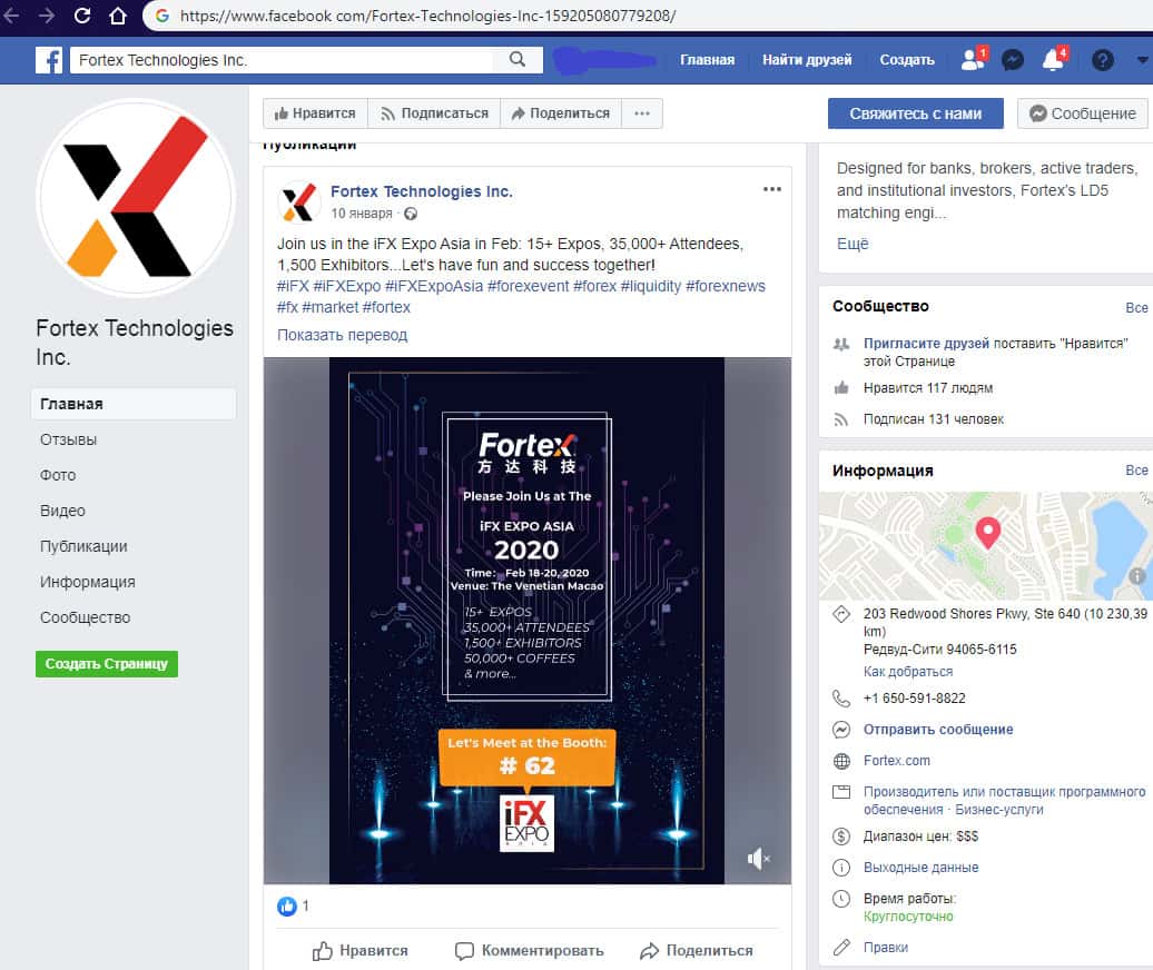 Дабы соответствовать современным трендам шулера Фортекс обзавелись страницами в социальных сетях одной из которых является Facebook, где у мошенников Fortex имеется около сотни подписчиков. На изображении, расположенном ниже, вы можете увидеть внешний вид страницы проходимцев Фортекс в социальной сети Фейсбук.