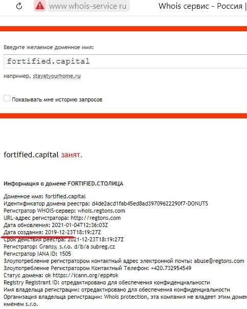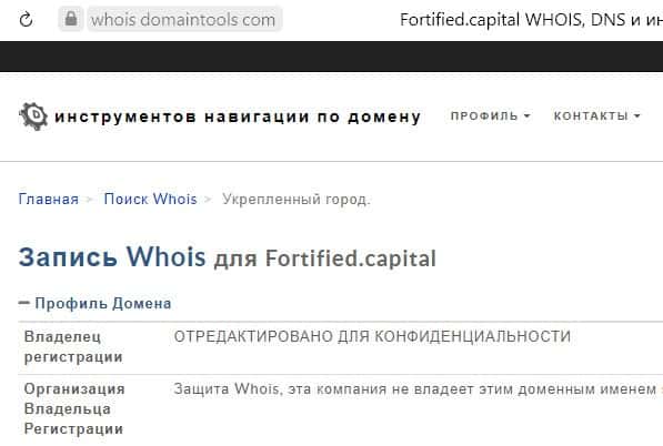 И в поисковиках никакой информации, подтверждающей громкое заявление балаболов Фортифид Капитал о своем зарождении в Москве, вы не сыщете. Согласно данным сайта Whoes домен fortified capital был зарегистрирован совсем недавно.
