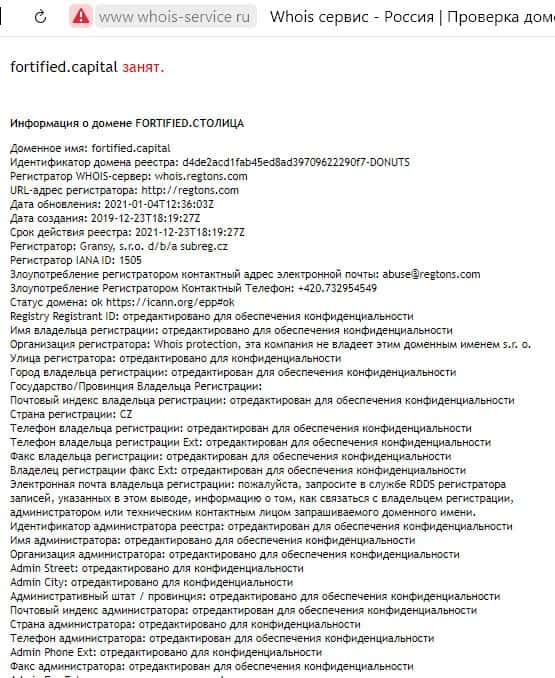 Все данные о владельце домена fortifid.capital конфиденциальны, что является явным признаком лохоразводил.
