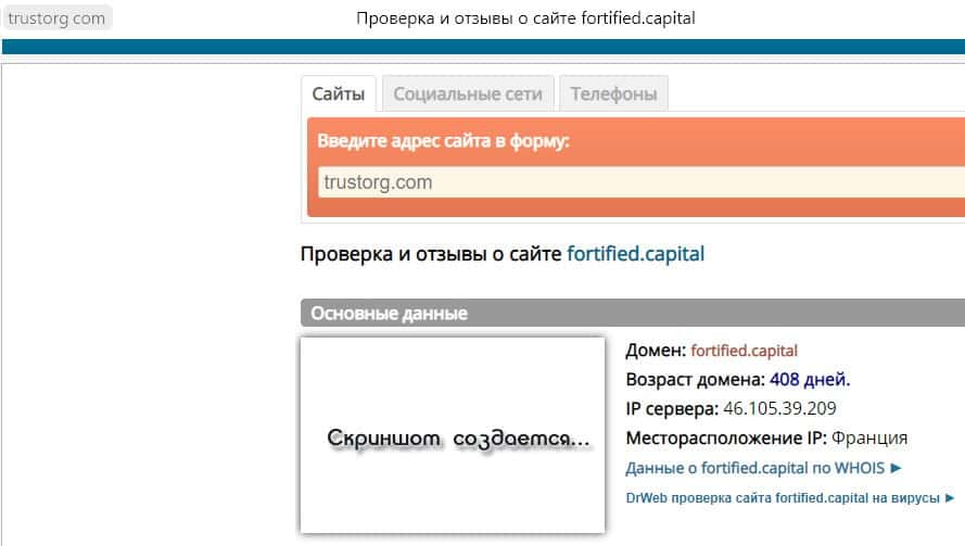 Проверка интернет-ресурса шулеров Фортифид Капитал на trustorg com показала, что возраст домена к моменту написания статьи составляет 408 дней.