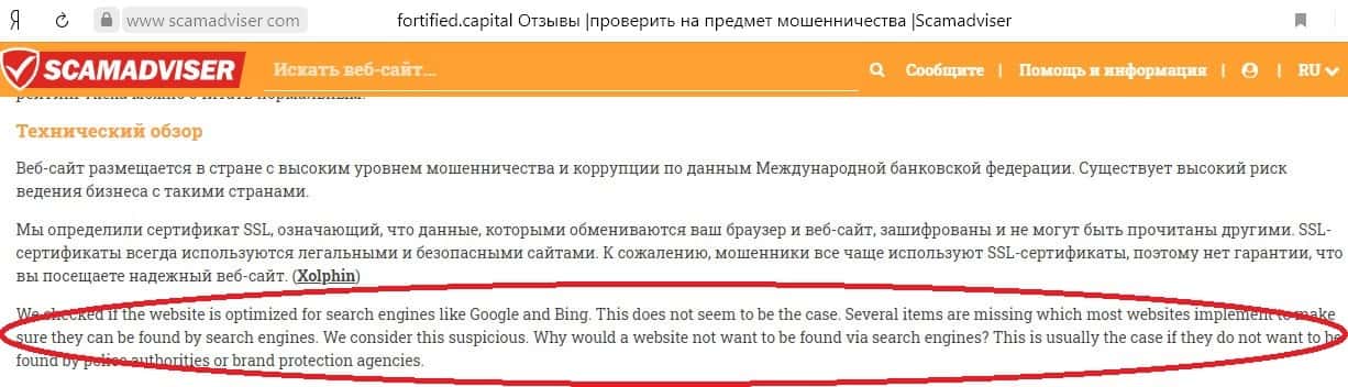 На что обращает наше внимание сайт Scamadviser в отношении к деятельности махинаторов Фортифид Капитал.