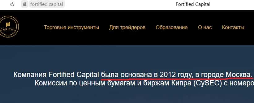 Чуть ниже приводим данные проверки домена fortified capital по WHOIS, из которой следует, что компания не владеет этим доменным именем!В разделе "О нас" заявлено, что компания Fortified Capital была основана в Москве в 2012 году. Не верьте, это наглое вранье!