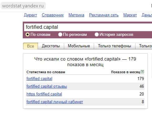 - Популярность Фортифид Капитал в поисковике Яндекс