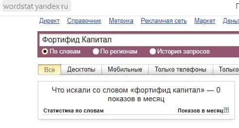 Лохоброкеры Фортифид Капитал совсем не так популярны, как хотят казаться. Количество запросов в системе Яндекс по бренду "Фортифид Капитал" на русском языке - о.