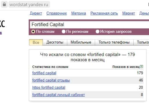 Не на много лучше обстоит дело с брендом "Fortified Capital" на английском языке - всего 179 запросов за месяц.