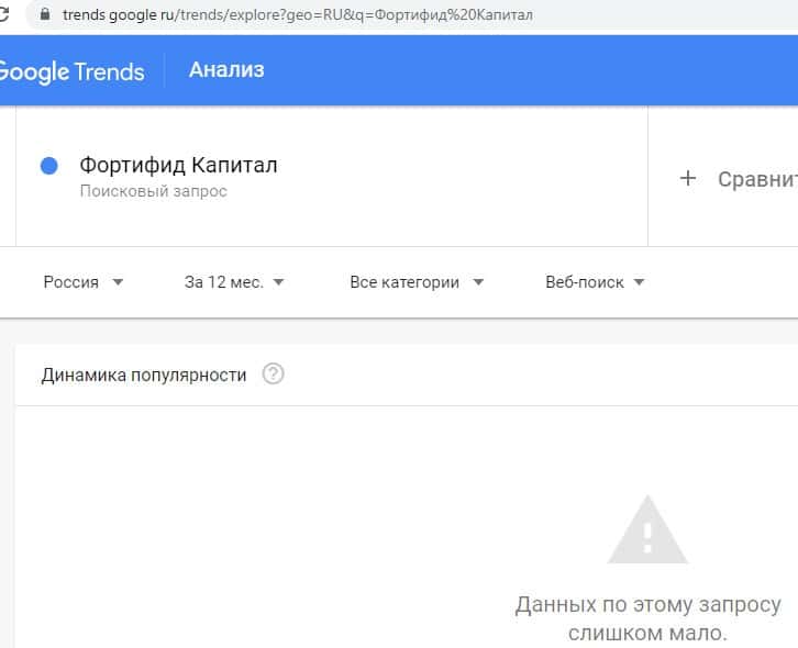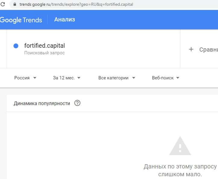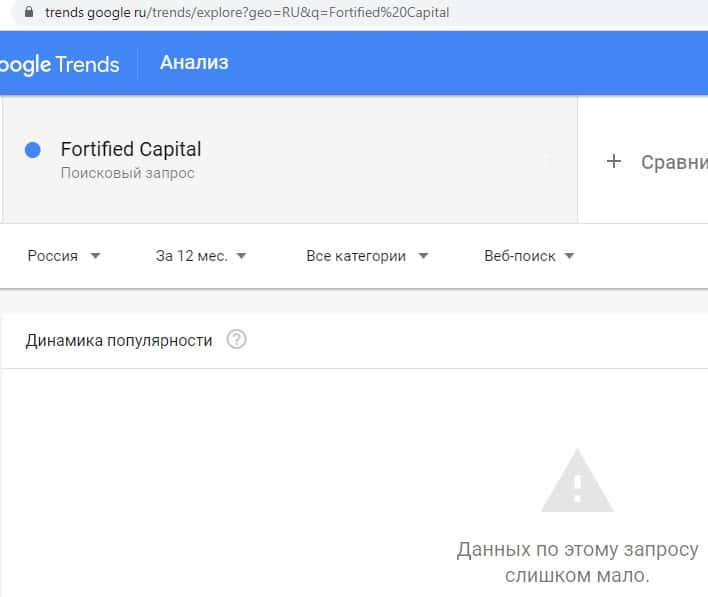 Результаты поискового запроса по бренду "Fortified Capital" на нуле. Google Trends не смог свести статистику из-за критично маленького количества запросов.