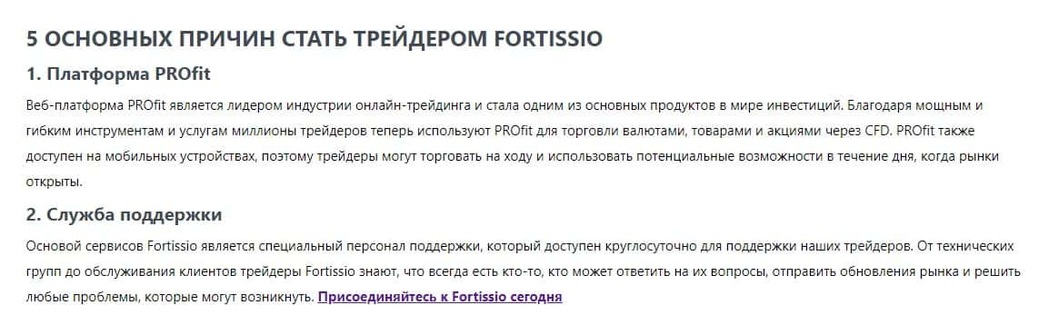 В данном разделе аферисты Фортиссио пытаются донести своим будущим трейдерам, то какие они хорошие и честные, и то как они умеют работать. Но это у них получается настолько плохо, что люди прочитавшие данный раздел уже перестают верить в их добросовестность и честность.