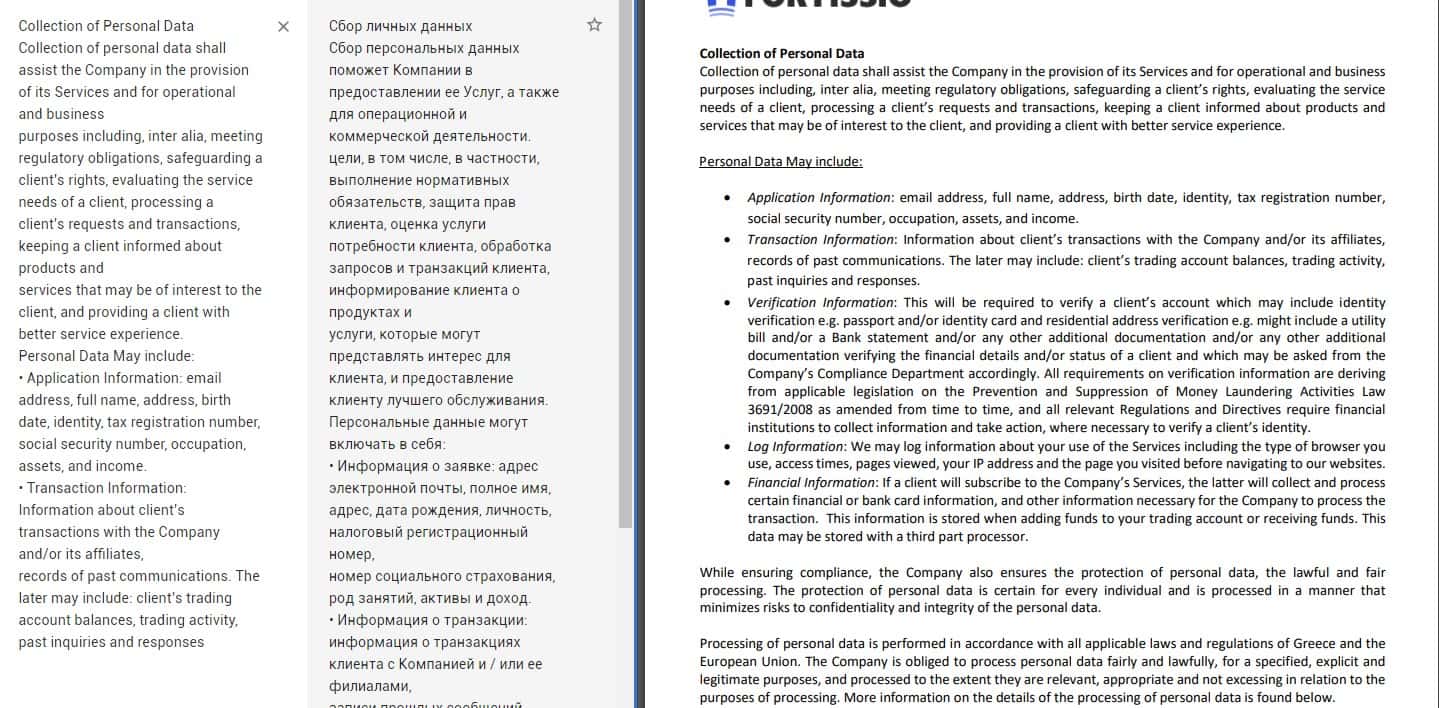 Политика конфиденциальности у аферистов Fortissio начинается со стандартной воды о том, что это за документ и зачем он нужен, в ходе которой мошенники Фортиссио говорят о том, что пользователи обязаны сливать свои данные лохотрону Fortissio. На изображении ниже вы можете увидеть начало политики конфиденциальности шулеров.