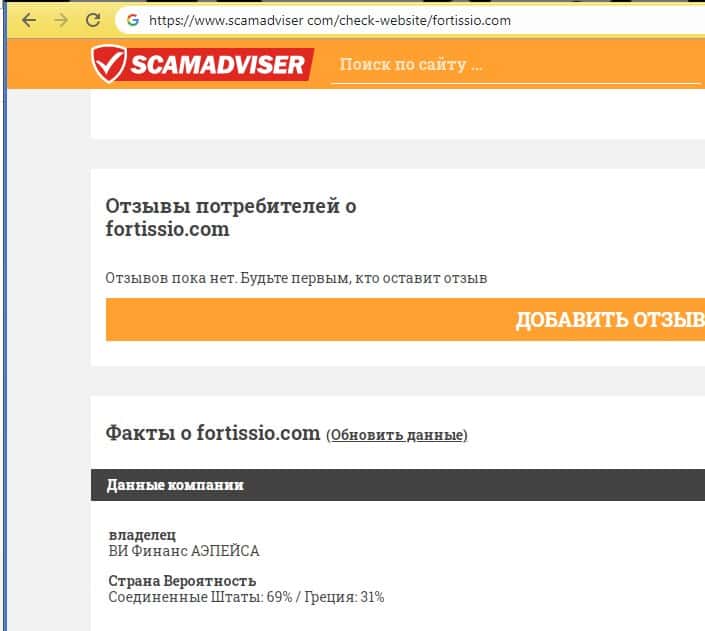 Понятное дело, что лохотрон Фортиссио занимается мошеннической и противозаконной деятельностью, его реальные руководители предпочитают анонимность дабы избежать ответственности со стороны правоохранительных органов. Техническую же информацию о сайте жулья Фортиссио можно узнать с помощью портала scamadviser com.