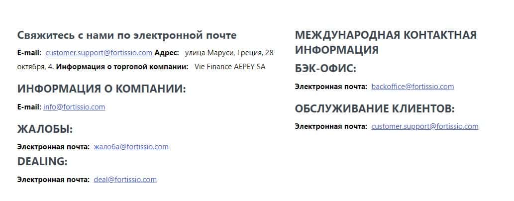 Под свои довольно сомнительные контакты аферисты Fortissio отвели отдельный раздел своего сайта, но также жулики Фортиссио разместили свои контакты и в конце подвального сайта. Контактов у шулеров Fortissio довольно мало. Перечень фальшивых контактов наглых мошенников Фортиссио в отдельном разделе: