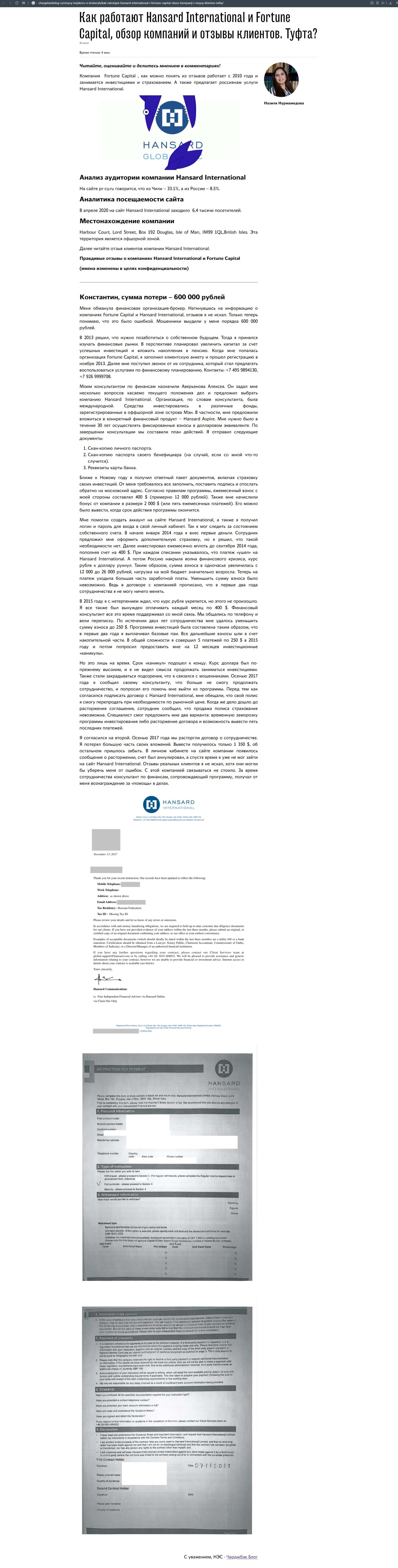 В данной статье-обзоре в подробностях рассказывается, как лохотрон Фортун Капитал вместе с подельниками Hansard International и обворовали клиента на сумму в 600 000 рублей.