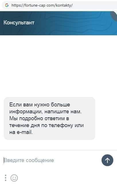 Жулики FortuneCapital предоставили в качестве обратной связи онлайн-чат, при помощи которого ведут сбор данных о клиенте, фиксируя все данные на сайте.