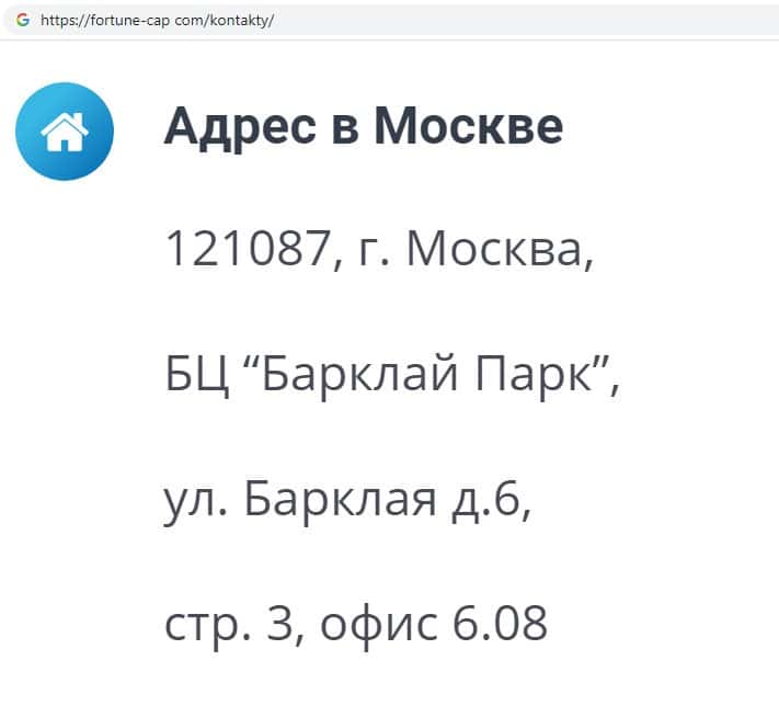 Обманщики Фортун Капитал указали адрес местонахождения главного офиса своей компании в Москве, который наверняка липовый: