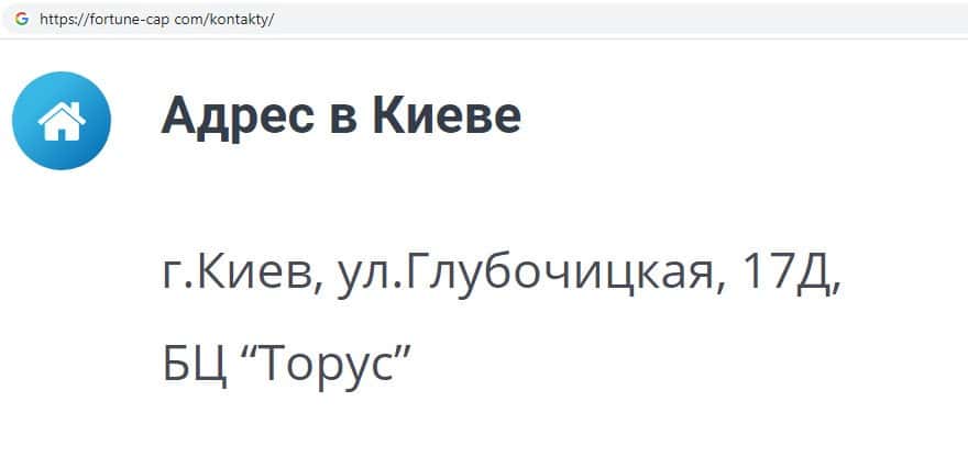 Мошенники FortuneCapital указывают еще один адрес местонахождения своего офиса, который якобы находится в Киеве: