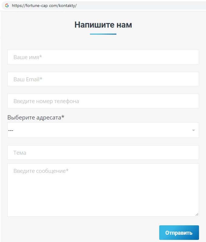 Лохотронщики Фортун Капитал предлагают пользователям заполнить бланк обратной связи, где просят указать свое имя, адрес электронной почты и номер контактного телефона.
