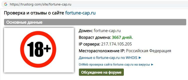 Проверка интернет-сервиса аферистов FortuneCapital на trustorg com показала, что возраст домена к моменту написания статьи составляет 3667 дней, вероятно домен купленный.
