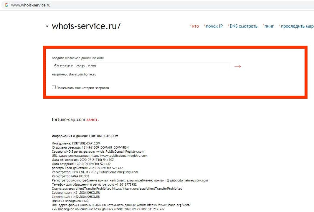 Информация о домене онлайн-ресурса мошенников FortuneCapital