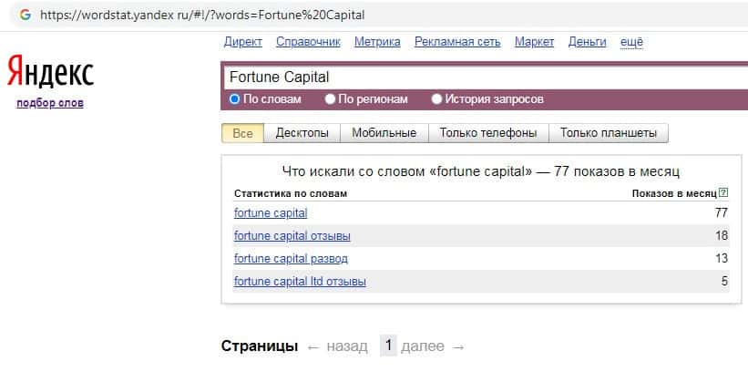 Количество брендовых запросов англоязычного названия компании с пробелом "Fortune Capital" на Вордстарт Яндекс Ру составляет 77 показов за месяц.