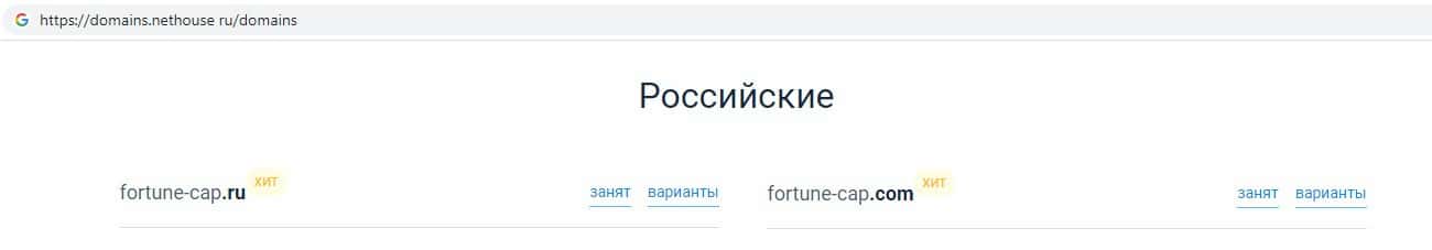 На веб-сервисе domains nethouse ru была произведена проверка домена fortune-cap com, которая показала то, что интернет-лохотрон Фортун Капитал находится также на сайте fortune-cap ru.