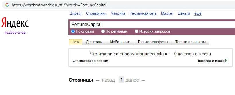 По количеству брендовых запросов названия компании на русском языке без пробела "ФортунКапитал" на Вордстарт Яндекс Ру также нет никакой информации.