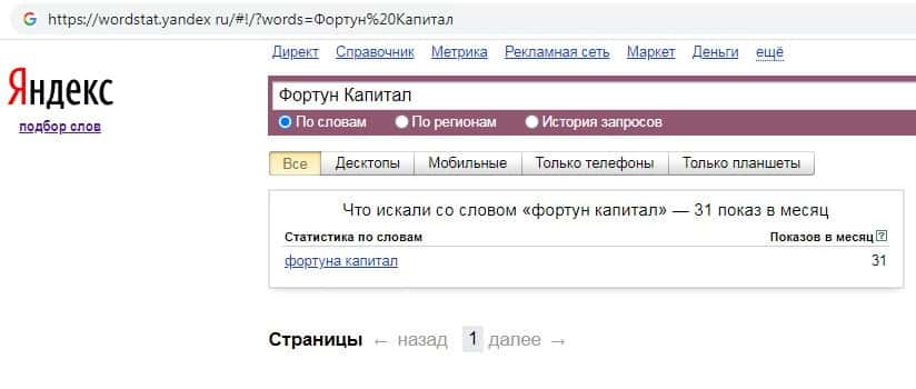 Количество запросов по бренду названия компании на русском языке с пробелом "Фортун Капитал" в поисковике Yandex составило 31 запрос за месяц.